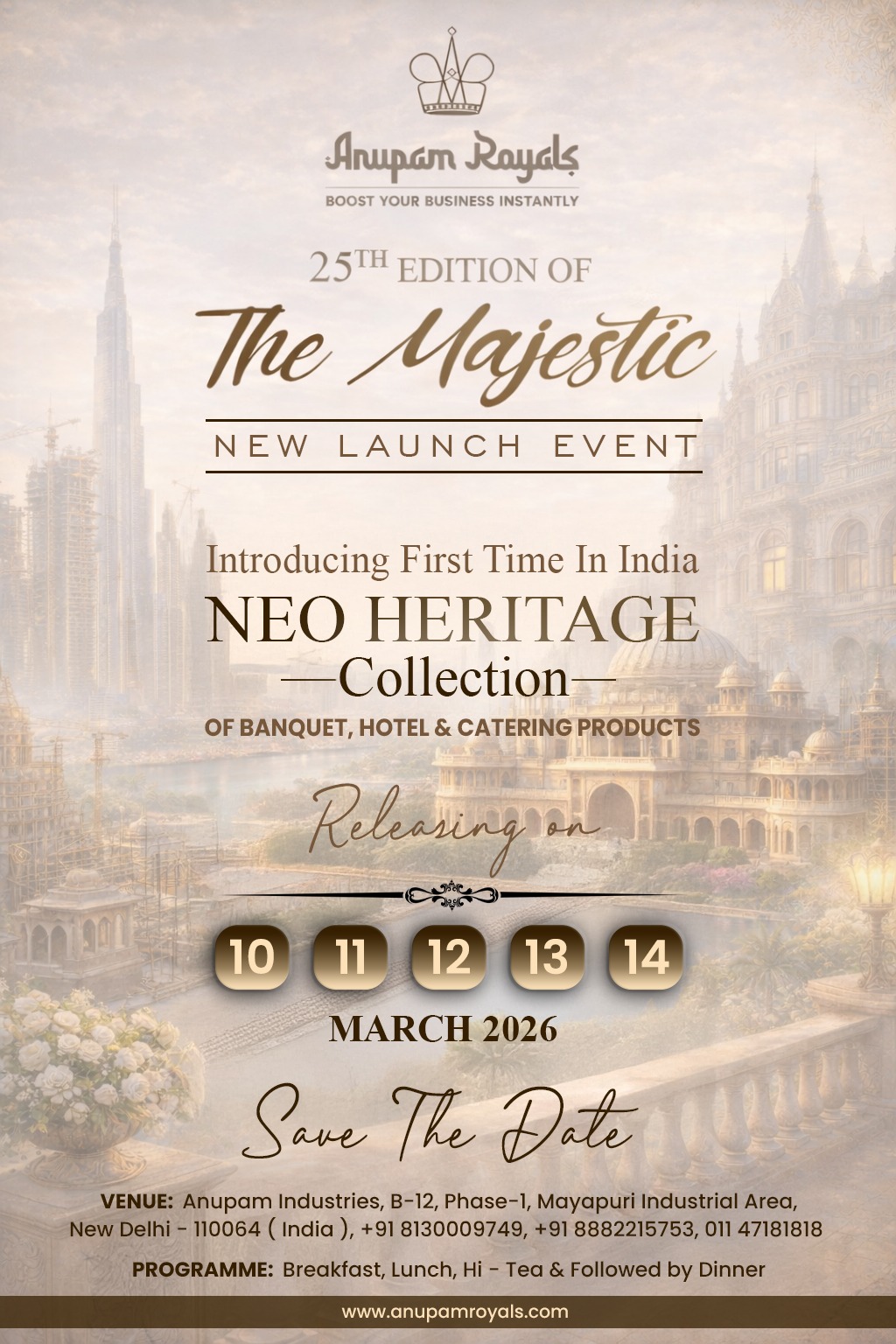 We are Anupam Royals, India's Largest and Specialized manufacturer of Hotels, Banquets and Catering Products such as Buffet Counters/Setups, Chafing Dishes, Dining furniture, Ready to Use Banquet Interiors, Banquet Gate, Trolleys, Tray Jack, Dustbin, Bowl, Riser, Platter etc. products for Ehoreca Industry. Our Infrastructure includes a well-established manufacturing unit in area of 3,50,000 SQFT at Kundli, Haryana and a Grand Display Centre in area of 87,500 SQFT at Mayapuri New Delhi. In the last 24 years, we have helped more than 38,500+ renowned Banquets, Hotels and Catering Companies across India and 18 other Countries to grow their Booking and minimizing their losses.